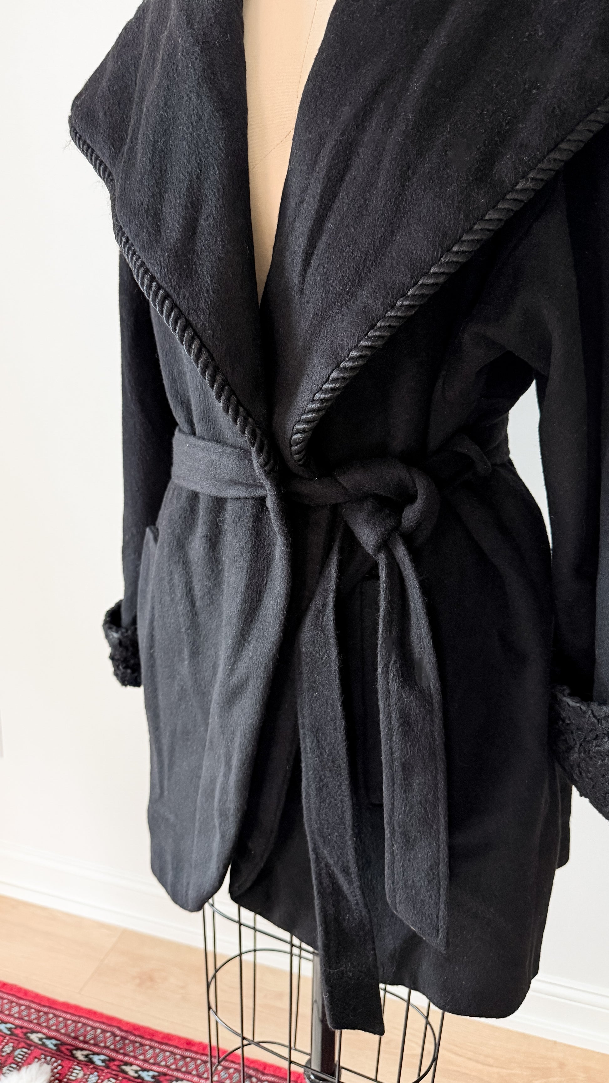Vintage 80s Lorovi Black Wool Cloak Tie Front Coat (S/M)