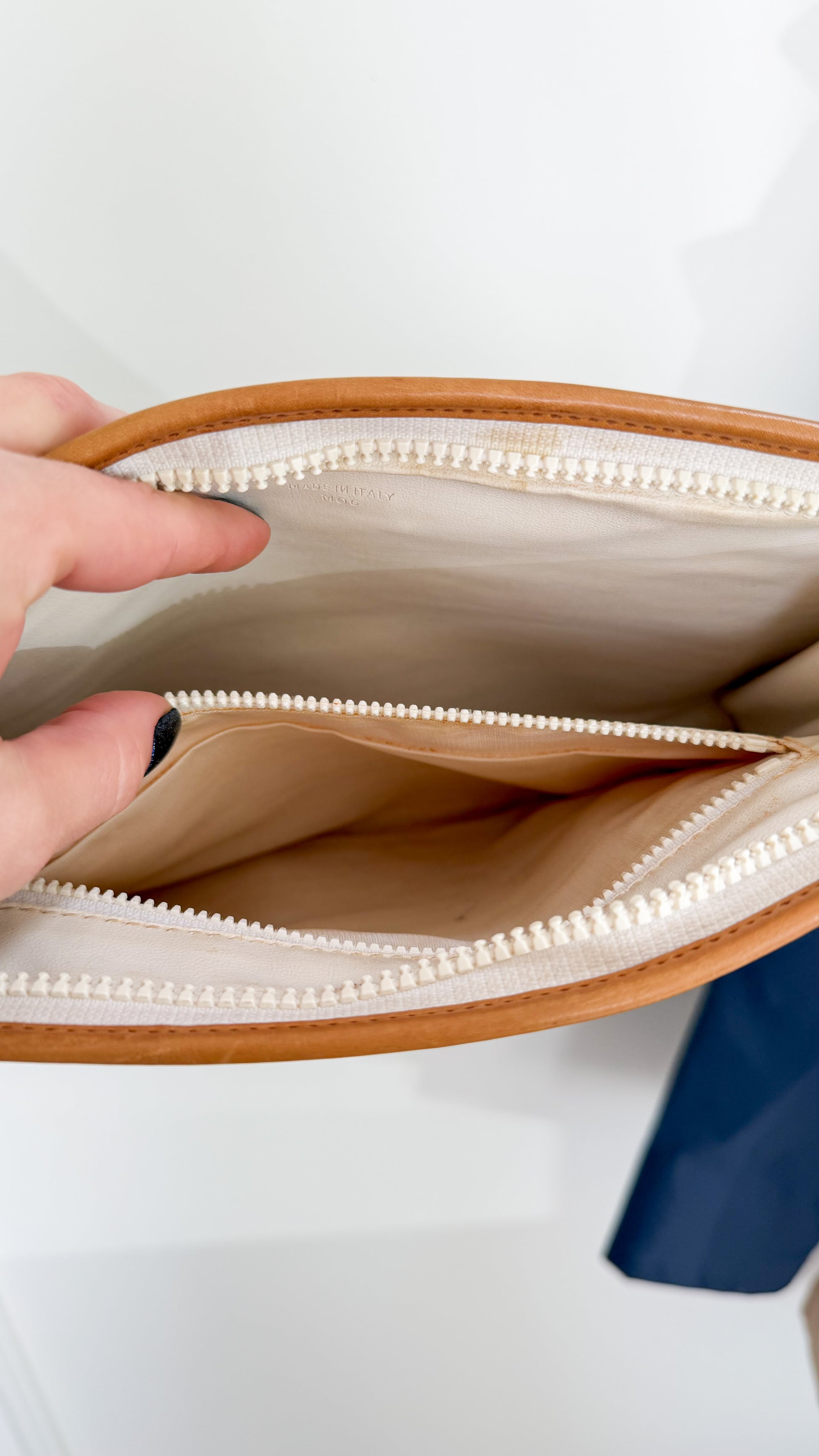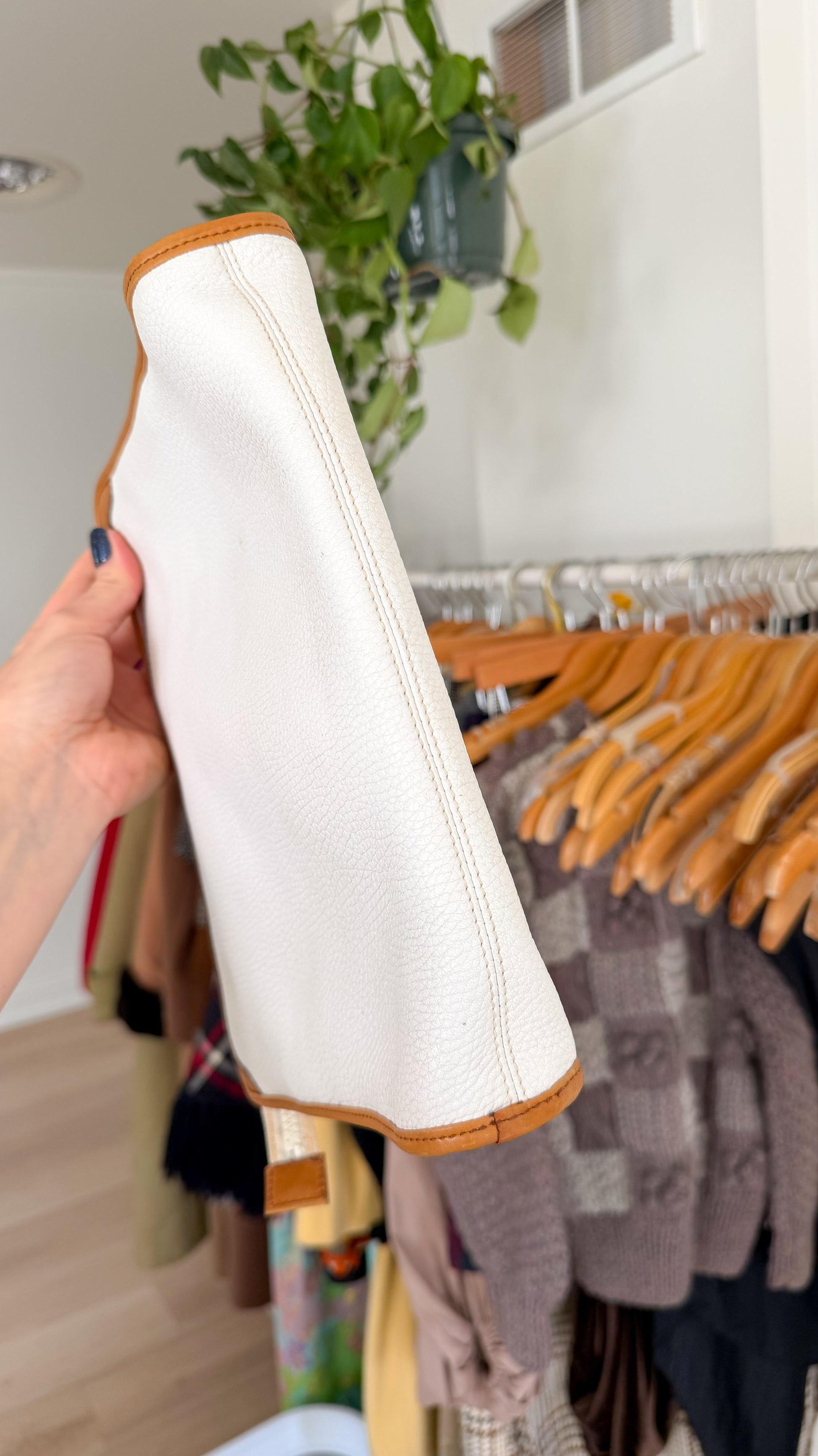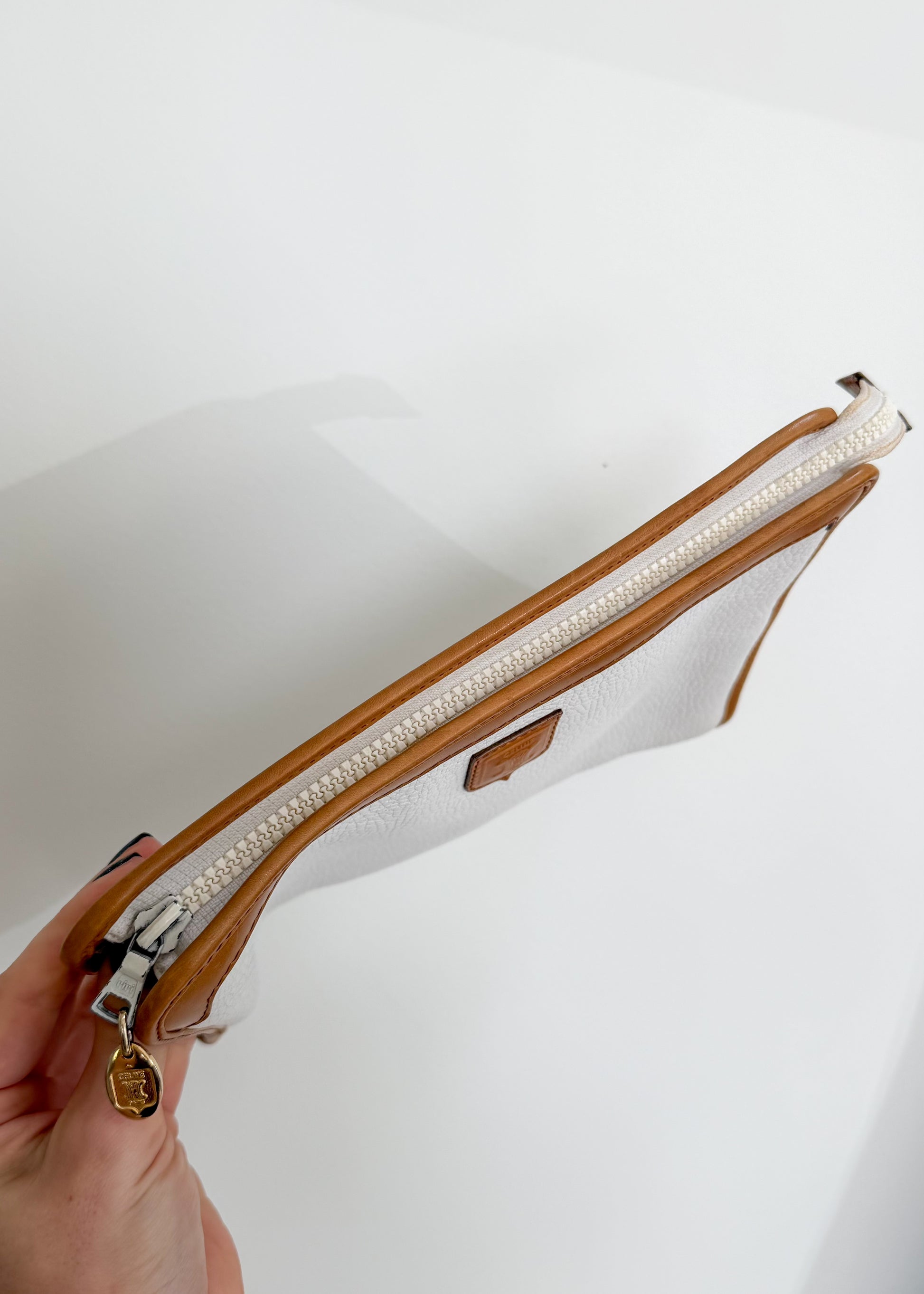 Beautiful vintage pouch clutch from luxury designer, Celine. Features white pebbled leather with light brown leather trim, zipped top and interior zipped pocket.