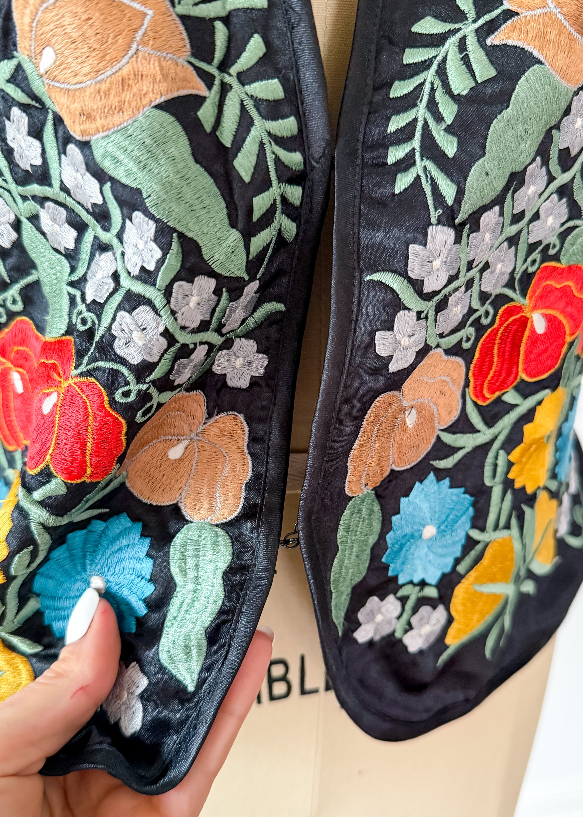 DETAILS: beautiful embroidered vest features a colorful floral design, 2 hook/eye clasps at the front and a tie around the back to adjust the waist. Made in India.